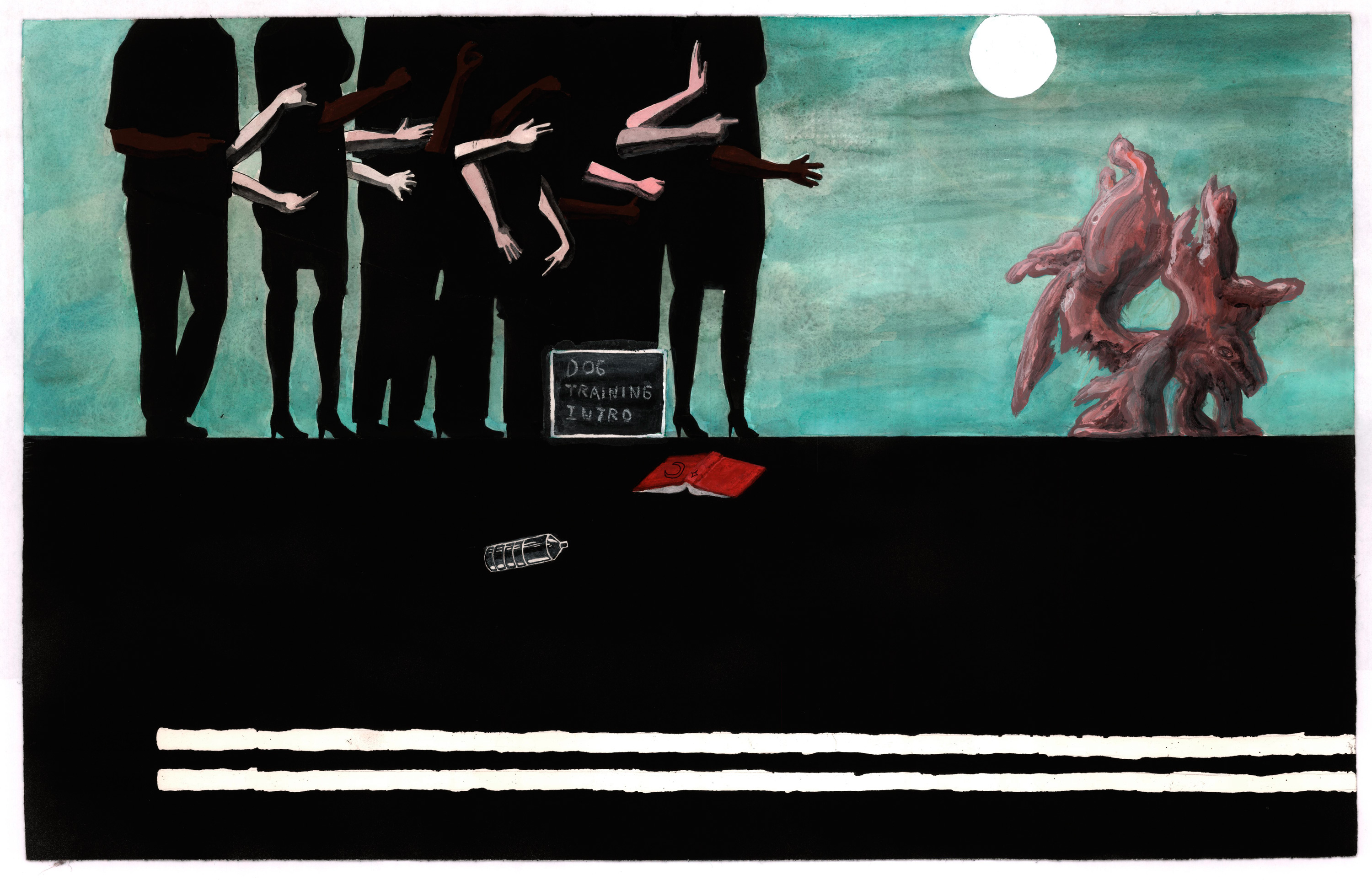 DOG TRAINING INTRO by bogusbobbylee 2018, acrylic on paper, 19x29 inches