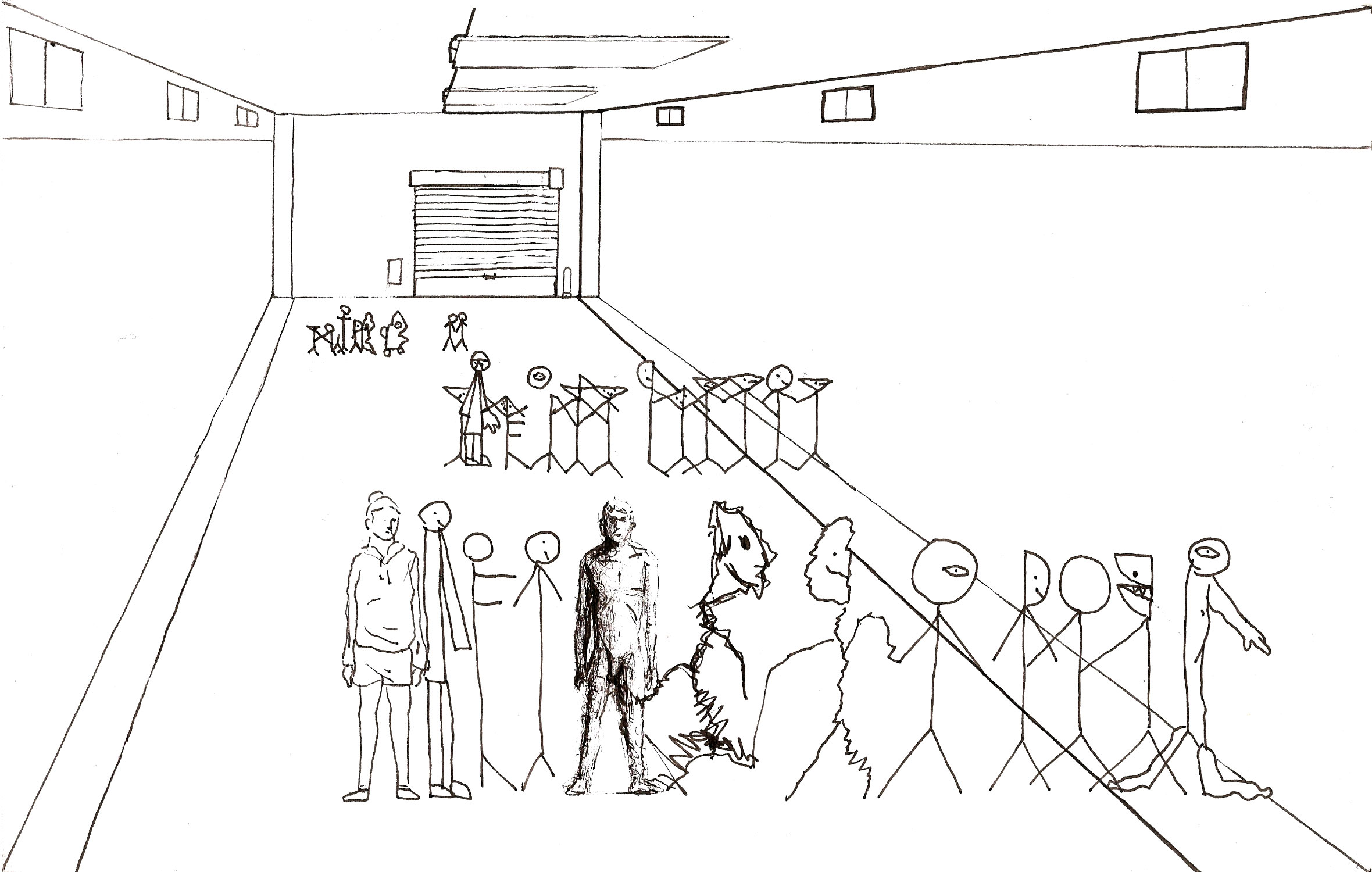 Tiny Happy People in a Basement Holding Hands 2020, ink on paper, 8½ x 11½ inches